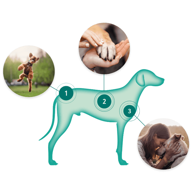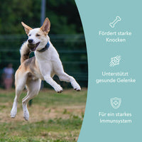 Unterstützende Substanzen für Knochen, Gelenkstrukturen, Muskulatur, Faszien und Nerven helfen dem Bewegungsapparat des Hundes auf allen Ebenen.